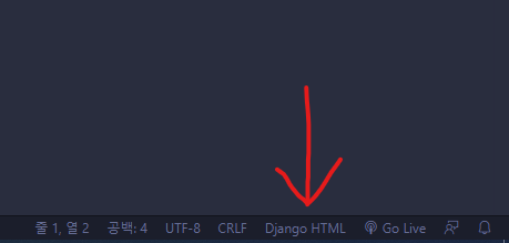 이제 VSCode의 우측 하단을 확인해야 한다. 우측하단을 보면 빨간 화살표가 있는 위치에 'Django HTML'이 선택되어 있는 모습이 보일것 이다.